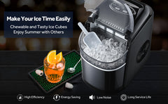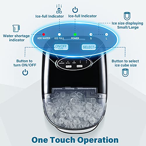 • Self-cleaning Function:Ice maker countertop with self-cleaning function, just press on/off button for 5s to start self-cleaning mode, which allows you not to spend time cleaning it basically. It would be better to add a small amount of lemonade and soda for cleaning.