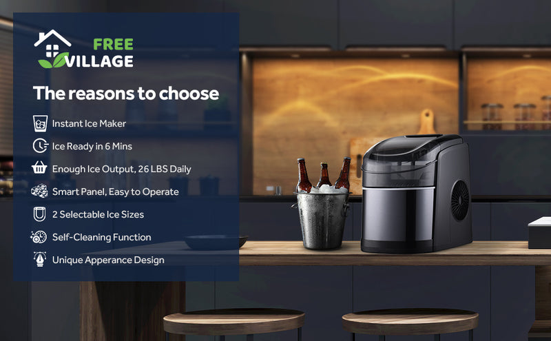 Details: Why Choose us ? Free Village is a company focused on researching ice makers and is committed to providing better products and services for each user. If you have and needs on ice making, Free Village ice maker will give you an excellent ice making experience. Product Introduction: Free Village ice maker is a smart portable ice maker. This product is equipped with an exhaust cooling system to prevent the machine from overheating while operating efficiently. The elegant and sleek design is both practical and decorative. Operating Method: 1. First, remove the ice basket and pour water into tank. 2. Second, press "ON/OFF" button to begin the ice making cycle. 3. Third, select the ice cube size by pressing the "SELECT" button. 4. Fourth, wait until the "ICE FULL" indicator on and take out the ice cubes. How to start the self-cleaning function: 1. Press "ON/OFF" button for more than 5 seconds. 2. Wait until self-cleaning program finish, it takes about 30 minutes. 3. Drain oou the water and clean inside. Product Parameters Item Model: HZB-12/C Item Dimensions: 13.89 x 9.53 x 13 inches Item Weight: 16.75 pounds Material: Plastic Voltage: DC 115V Product List: Machine X 1 Manual X 1 Ice basket X 1 Ice scoop X 1